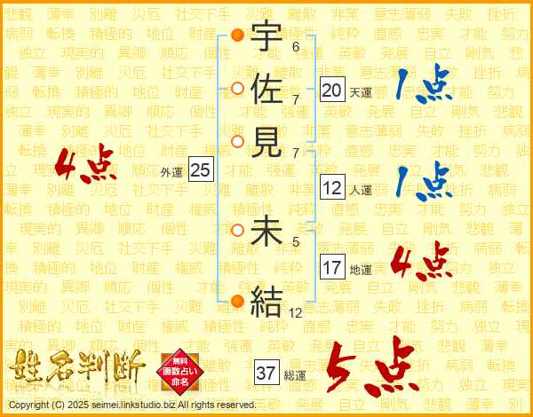 宇(6画)佐(7画)見(7画) 未(5画)結(12画)