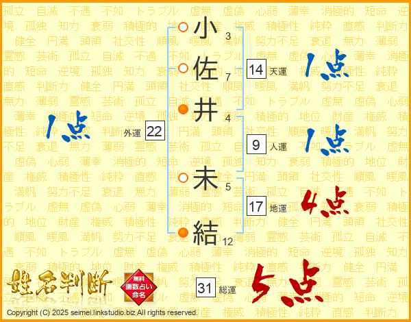 小(3画)佐(7画)井(4画) 未(5画)結(12画)