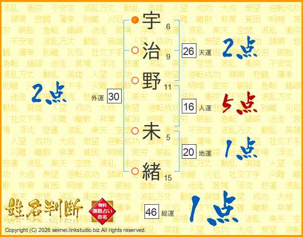 宇(6画)治(9画)野(11画) 未(5画)緒(15画)