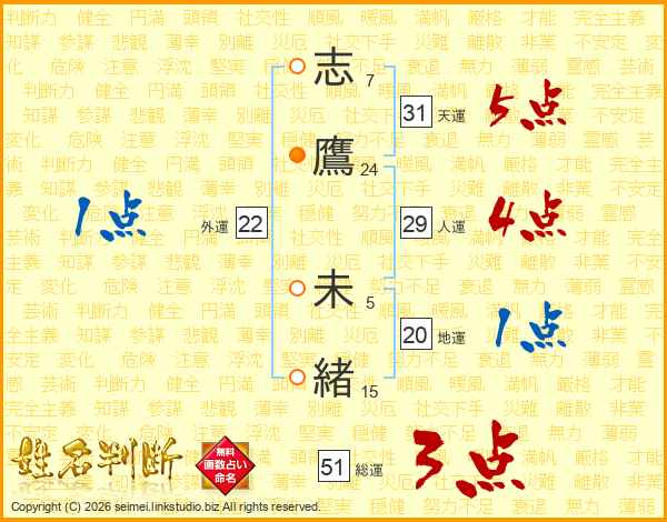 志(7画)鷹(24画) 未(5画)緒(15画)