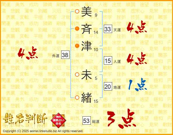 美(9画)斉(14画)津(10画) 未(5画)緒(15画)