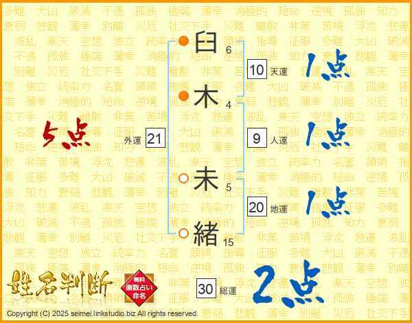 生活面を象徴する運勢です。外部から受ける影響力を表し、結婚運、家庭運や職場、環境への順応性を表します。総運から人運を引いた画数。姓や名が1文字の場合を除く。
