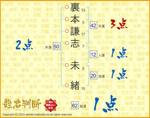 裏(13画)本(5画)謙(17画)志(7画) 未(5画)緒(15画)