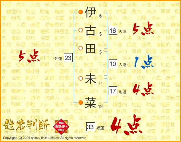 伊(6画)古(5画)田(5画) 未(5画)菜(12画)