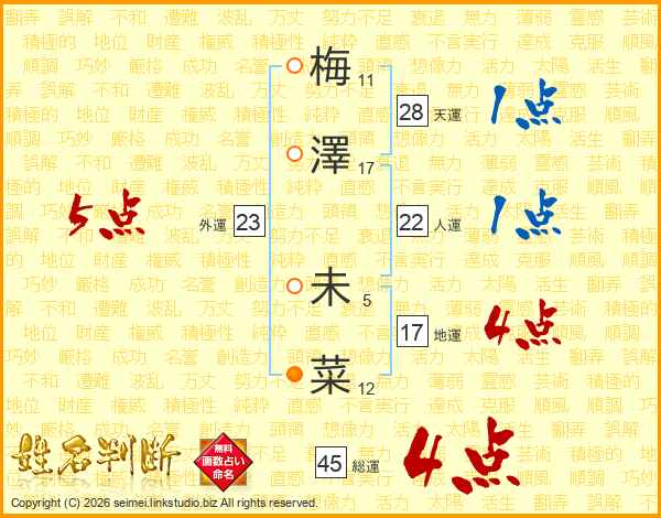 梅(11画)澤(17画) 未(5画)菜(12画)