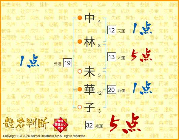 中(4画)林(8画) 未(5画)華(12画)子(3画)