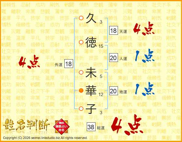 久(3画)徳(15画) 未(5画)華(12画)子(3画)