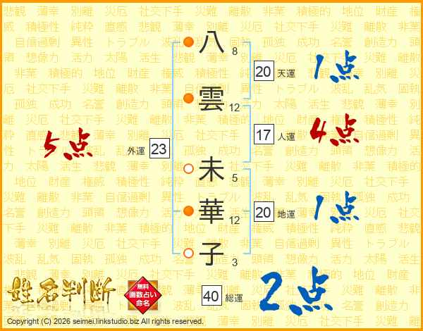 八(8画)雲(12画) 未(5画)華(12画)子(3画)