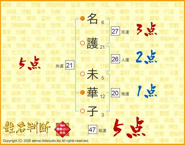 名(6画)護(21画) 未(5画)華(12画)子(3画)