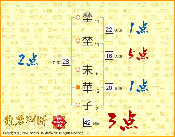生活面を象徴する運勢です。外部から受ける影響力を表し、結婚運、家庭運や職場、環境への順応性を表します。総運から人運を引いた画数。姓や名が1文字の場合を除く。