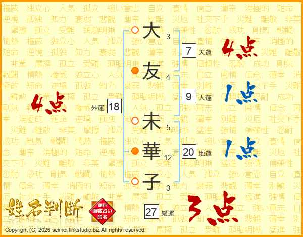 大(3画)友(4画) 未(5画)華(12画)子(3画)