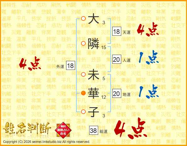 大(3画)隣(15画) 未(5画)華(12画)子(3画)