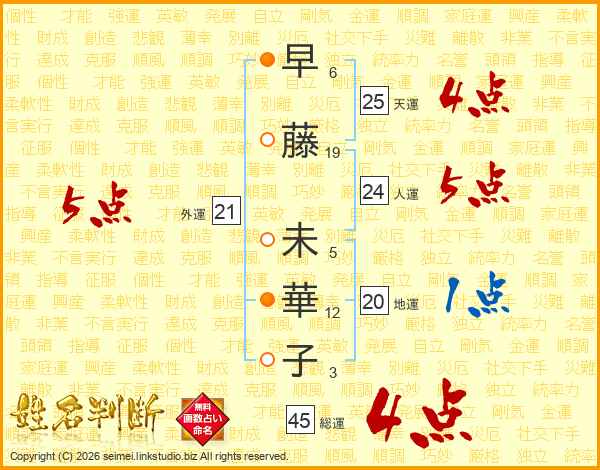 早(6画)藤(19画) 未(5画)華(12画)子(3画)