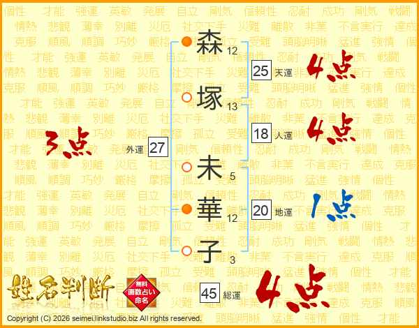 森(12画)塚(13画) 未(5画)華(12画)子(3画)