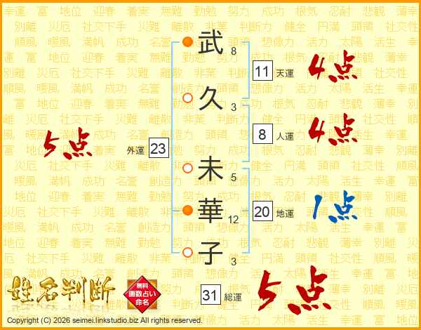 武(8画)久(3画) 未(5画)華(12画)子(3画)