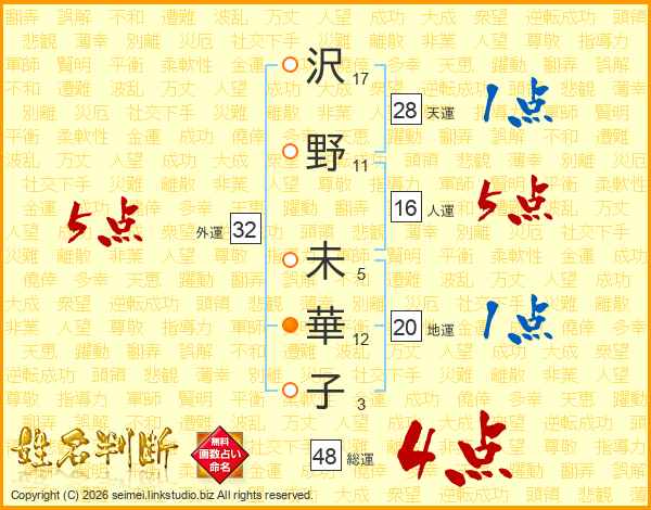 沢(17画)野(11画) 未(5画)華(12画)子(3画)