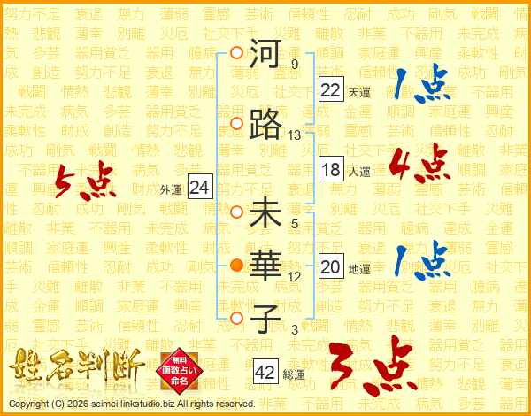 河(9画)路(13画) 未(5画)華(12画)子(3画)