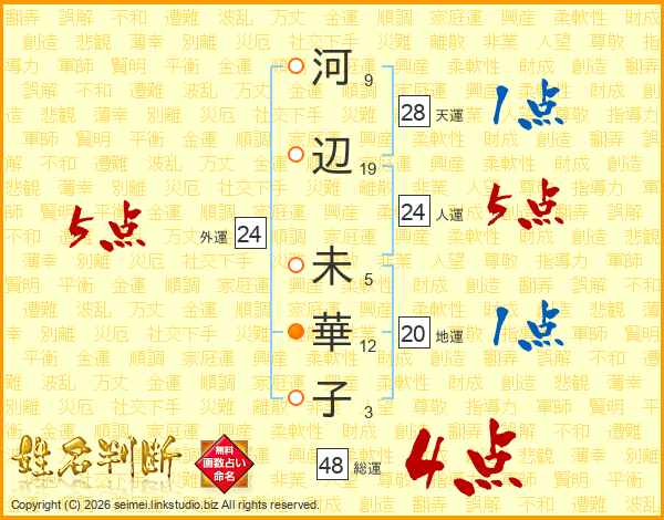 河(9画)辺(19画) 未(5画)華(12画)子(3画)