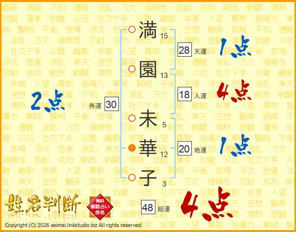 満(15画)園(13画) 未(5画)華(12画)子(3画)