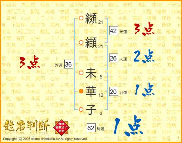 生活面を象徴する運勢です。外部から受ける影響力を表し、結婚運、家庭運や職場、環境への順応性を表します。総運から人運を引いた画数。姓や名が1文字の場合を除く。