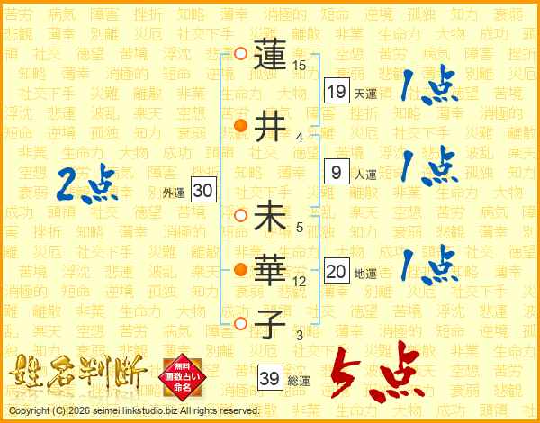 蓮(15画)井(4画) 未(5画)華(12画)子(3画)