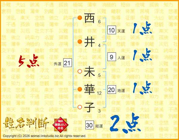 西(6画)井(4画) 未(5画)華(12画)子(3画)