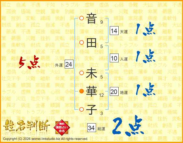 音(9画)田(5画) 未(5画)華(12画)子(3画)