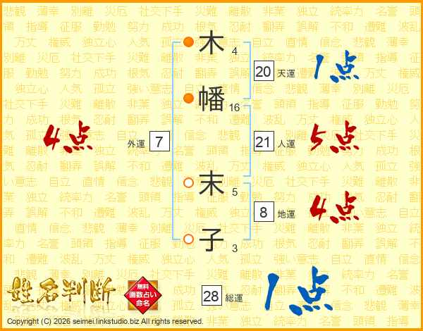木(4画)幡(16画) 末(5画)子(3画)