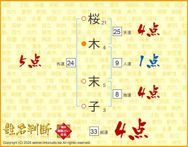 桜(21画)木(4画) 末(5画)子(3画)