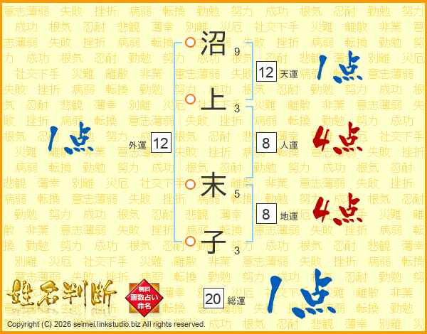 沼(9画)上(3画) 末(5画)子(3画)