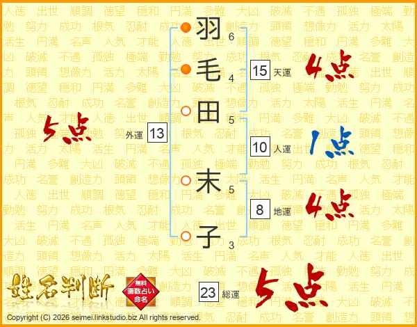 羽(6画)毛(4画)田(5画) 末(5画)子(3画)