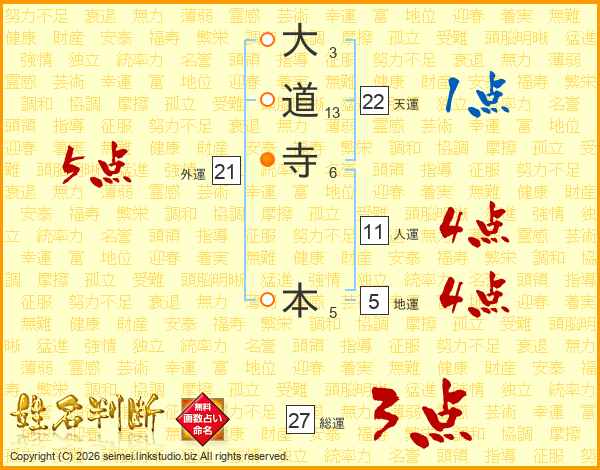 あなたの人生を表す1番重要な運勢です。生涯を通じて影響する総合運となり、主に50歳以降の晩年期に影響を及ぼします。苗字と名前の合計画数。