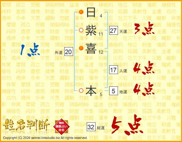 あなたの人生を表す1番重要な運勢です。生涯を通じて影響する総合運となり、主に50歳以降の晩年期に影響を及ぼします。苗字と名前の合計画数。