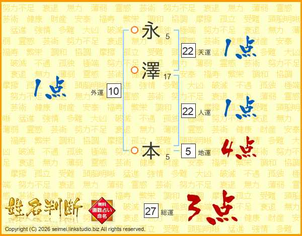 生活面を象徴する運勢です。外部から受ける影響力を表し、結婚運、家庭運や職場、環境への順応性を表します。総運から人運を引いた画数。姓や名が1文字の場合を除く。