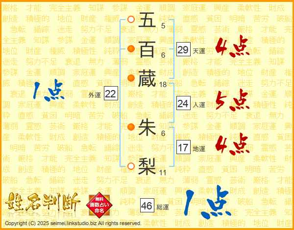 五(5画)百(6画)蔵(18画) 朱(6画)梨(11画)