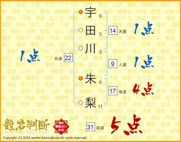 宇(6画)田(5画)川(3画) 朱(6画)梨(11画)