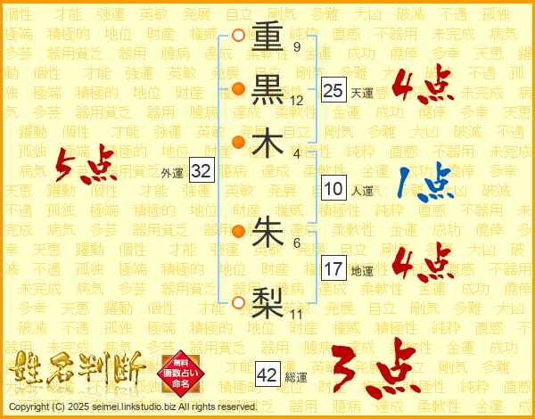 重(9画)黒(12画)木(4画) 朱(6画)梨(11画)