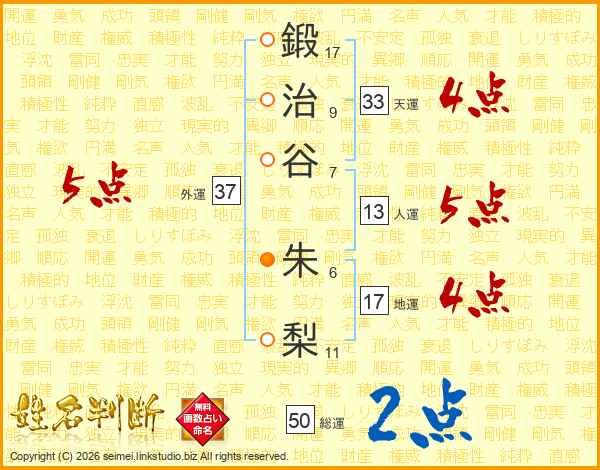 鍛(17画)治(9画)谷(7画) 朱(6画)梨(11画)