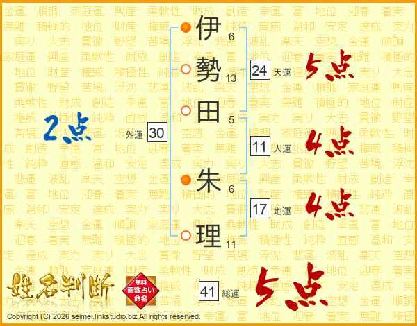 伊(6画)勢(13画)田(5画) 朱(6画)理(11画)