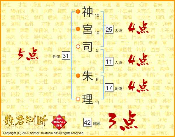神(10画)宮(10画)司(5画) 朱(6画)理(11画)