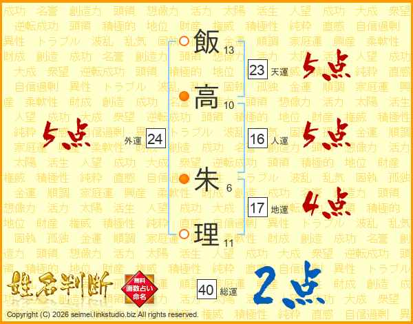 あなたの人生を表す1番重要な運勢です。生涯を通じて影響する総合運となり、主に50歳以降の晩年期に影響を及ぼします。苗字と名前の合計画数。