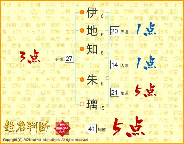 伊(6画)地(6画)知(8画) 朱(6画)璃(15画)