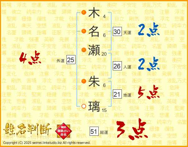 木(4画)名(6画)瀬(20画) 朱(6画)璃(15画)