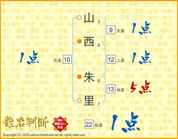 生活面を象徴する運勢です。外部から受ける影響力を表し、結婚運、家庭運や職場、環境への順応性を表します。総運から人運を引いた画数。姓や名が1文字の場合を除く。