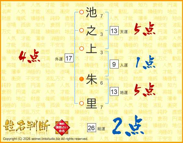 池之上朱里さんの天運は13画の5点!