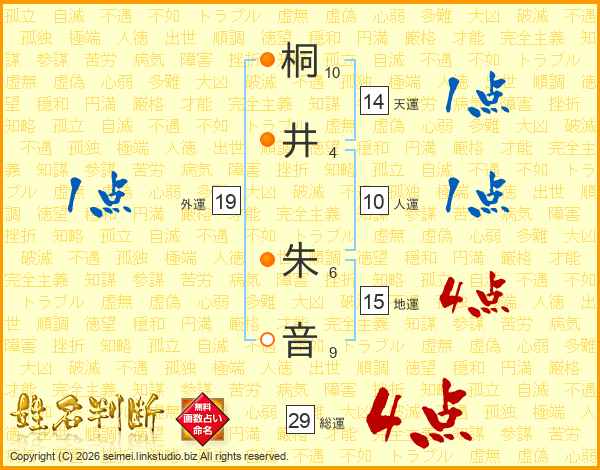 桐(10画)井(4画) 朱(6画)音(9画)