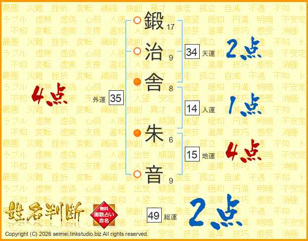 鍛(17画)治(9画)舎(8画) 朱(6画)音(9画)