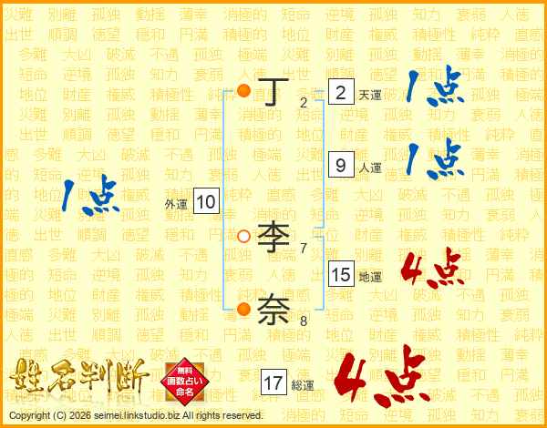 生活面を象徴する運勢です。外部から受ける影響力を表し、結婚運、家庭運や職場、環境への順応性を表します。総運から人運を引いた画数。姓や名が1文字の場合を除く。