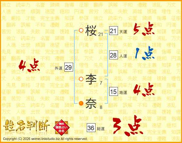 桜(21画) 李(7画)奈(8画)