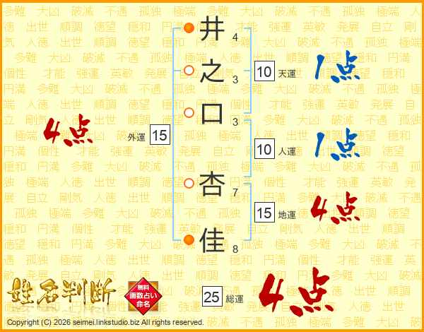 井(4画)之(3画)口(3画) 杏(7画)佳(8画)